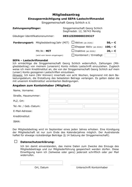 Einfach Online ausfüllen, drucken, unterschreiben und an eines der Vorstandsmitglieder senden.